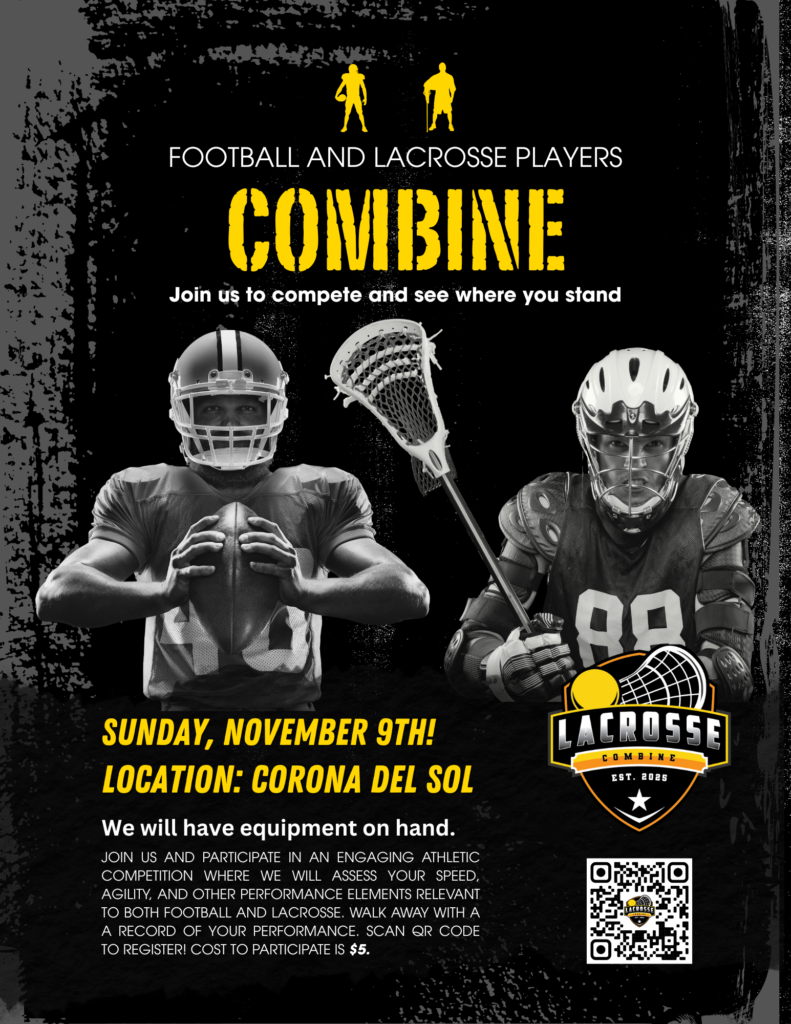 Have a younger sibling interested in playing lacrosse? Or possibly a neighbor down the street? Tempe Sol will be hosting 2 Try Lax Clinics at Benedict Sports Complex on November 2nd and 22nd. If interested, scan the QR Code and register to be entered to win a lacrosse stick. Please spread the word and help…